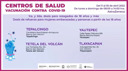 La estrategia de vacunación se distribuirá de la siguiente manera: de lunes a viernes, de 08:00 a 14:00 horas, la dosis estará disponible en la Jurisdicción Sanitaria I: centro de salud Tres Marías, en avenida Zempoala, sin número, en Huitzilac; en Temixco, la dirección es calle Margaritas, número 65, colonia Centro.