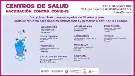 La Secretaría de Salud convocó a participar en esta jornada de vacunación durante el mes de abril, para completar su esquema o acudir por la dosis de refuerzo, toda vez que el biológico contra el virus SARS-CoV-2, previene un cuadro grave de la enfermedad.
