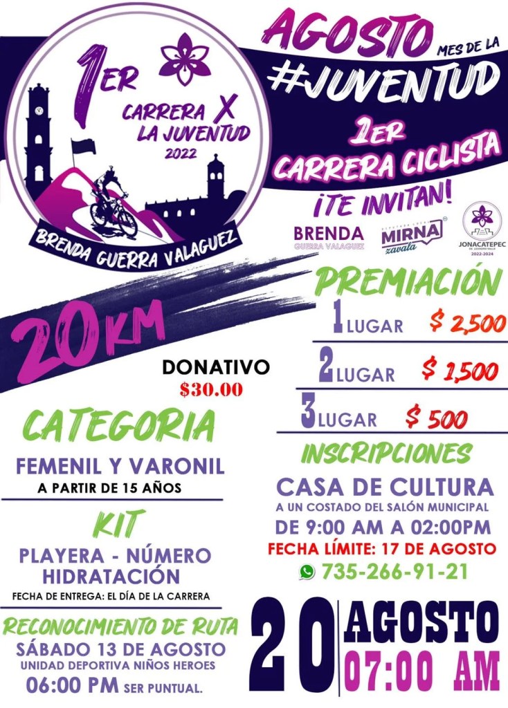 Con la intención de promover el deporte y la sana convivencia así como celebrar el mes de la juventud, el gobierno municipal de Jonacatepec que preside Brenda Guerra Valaguez, organiza una carrera ciclista y un recorrido familiar que efectuaran el próximo 20 de agosto.